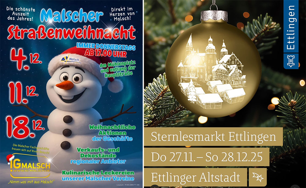 Wir sind vom 05.12. bis einschließlich 08.12. auf dem Ettlinger Weihnachtsmarkt in der Sternschnuppenhütte 4 und jeden Donnerstag bei der Malscher Straßenweihnacht zu finden.